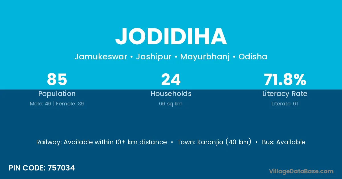 Karanjia (40 km) is the nearest town to Jodidiha village for major economic activities and is located approximately 40 km away.