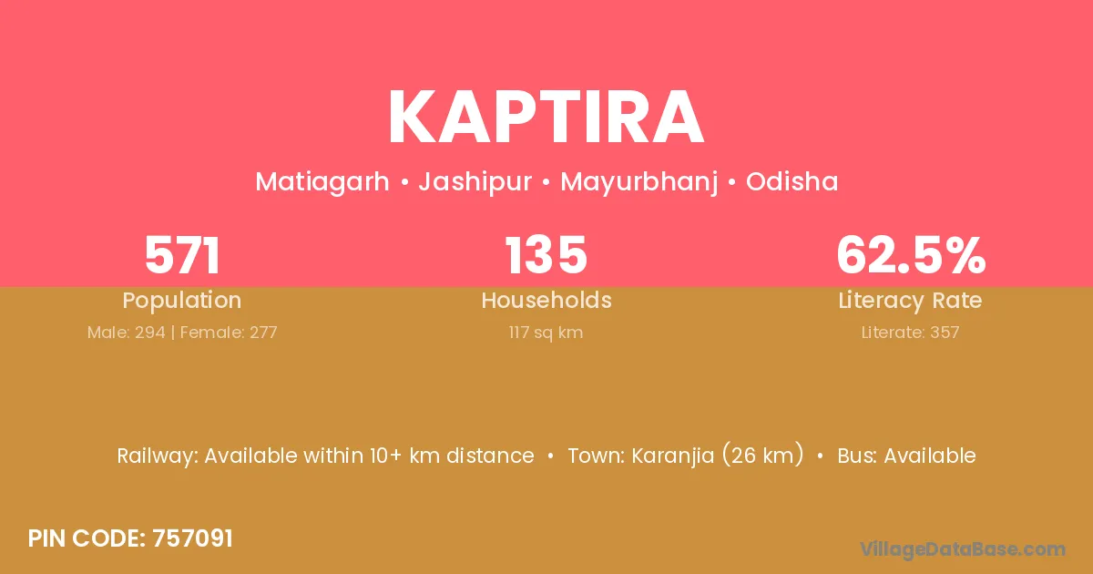 Karanjia (26 km) is the nearest town to Kaptira village for major economic activities and is located approximately 26 km away.