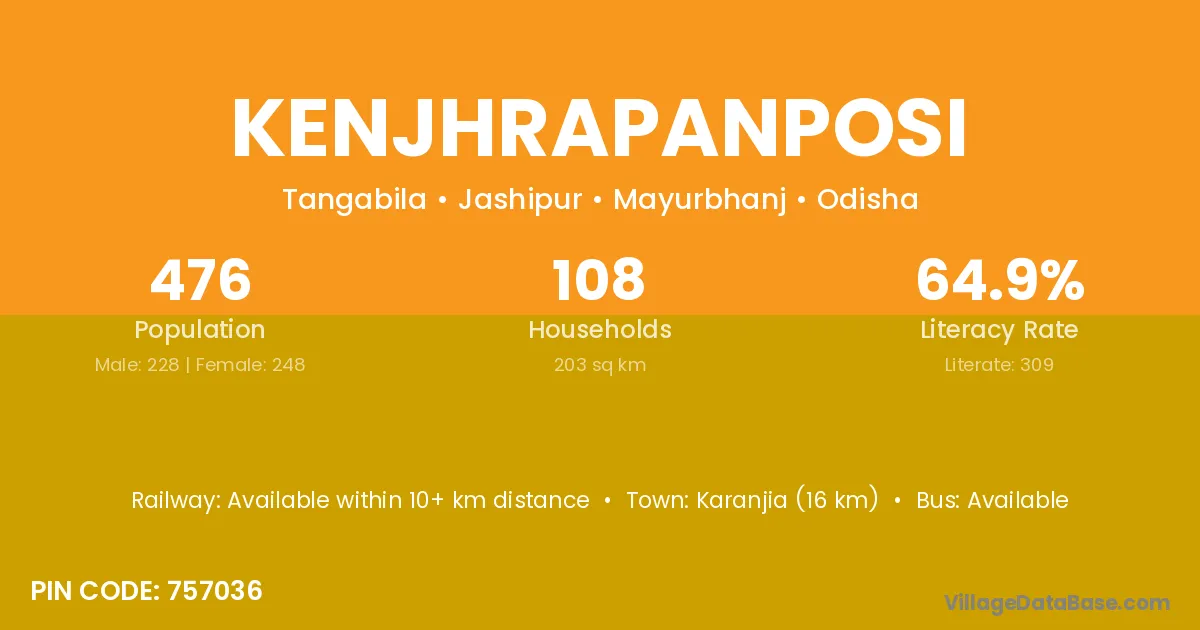 Karanjia (16 km) is the nearest town to Kenjhrapanposi village for major economic activities and is located approximately 16 km away.