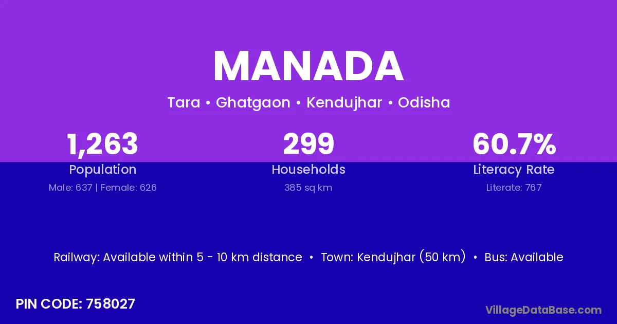 Karanjia (35 km) is the nearest town to Manada village for major economic activities and is located approximately 35 km away.