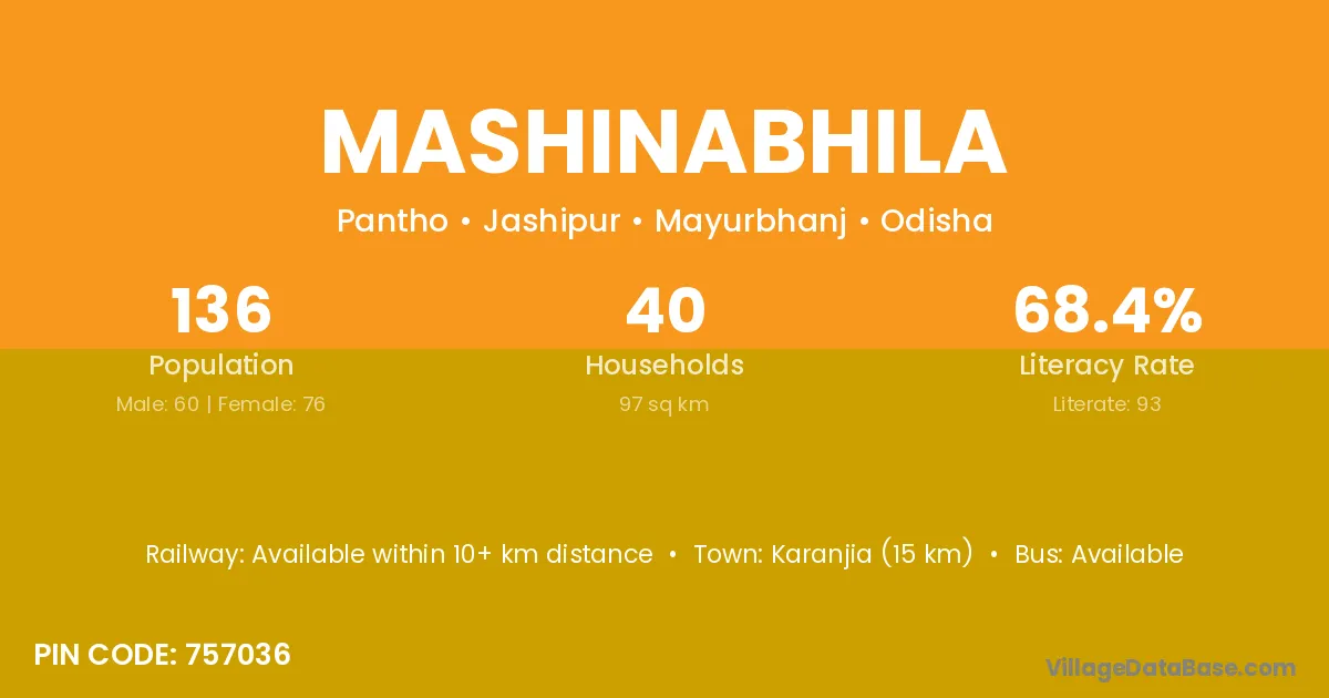 Karanjia (15 km) is the nearest town to Mashinabhila village for major economic activities and is located approximately 15 km away.