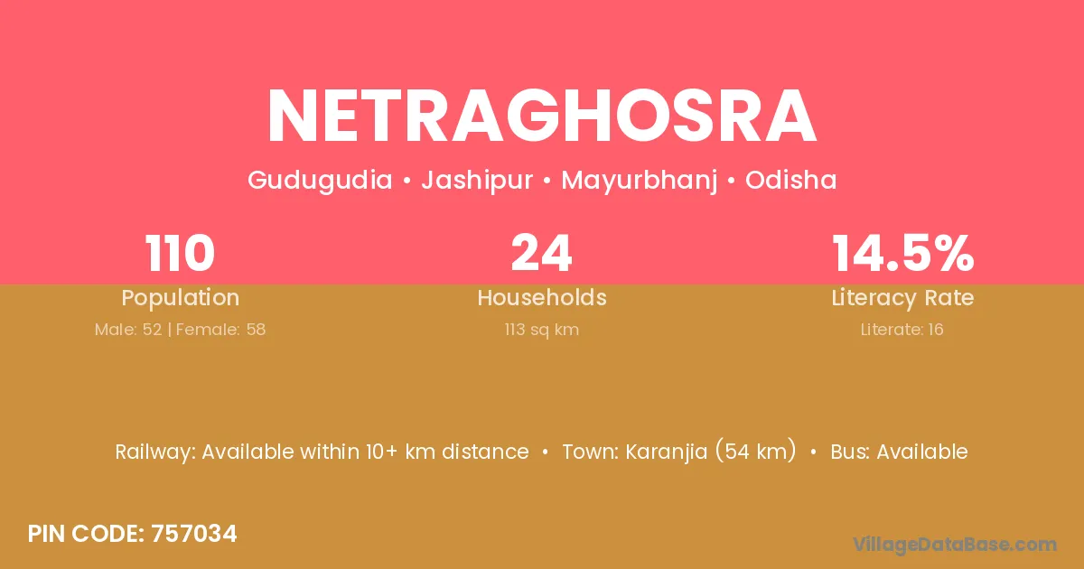 Karanjia (54 km) is the nearest town to Netraghosra village for major economic activities and is located approximately 54 km away.