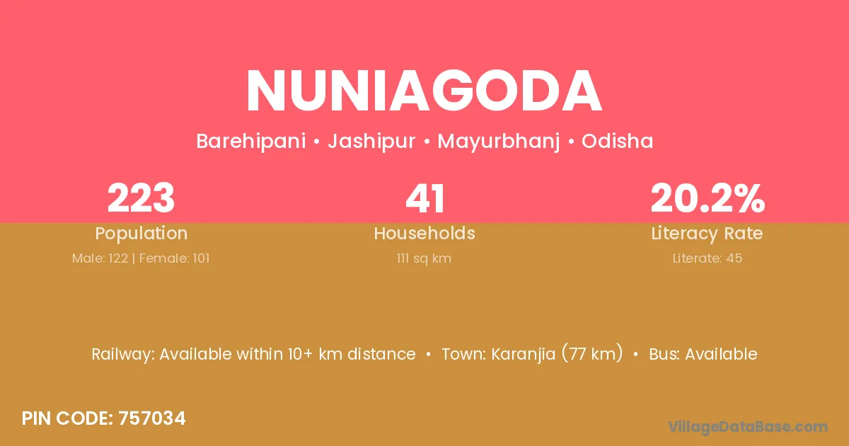 Karanjia (77 km) is the nearest town to Nuniagoda village for major economic activities and is located approximately 77 km away.