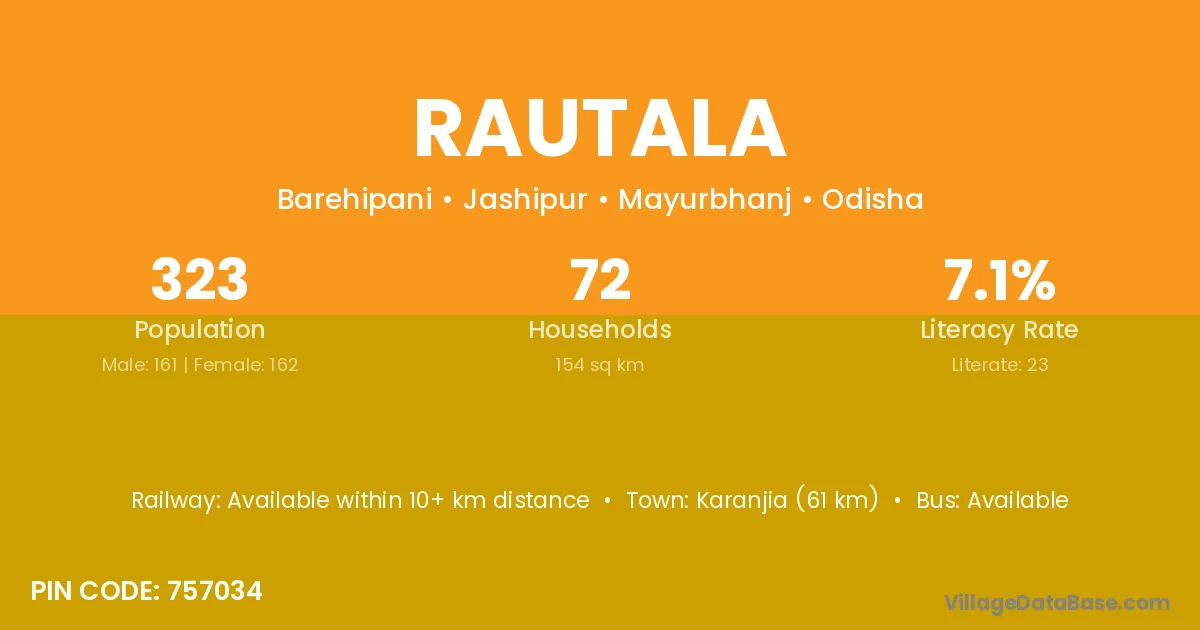Karanjia (61 km) is the nearest town to Rautala village for major economic activities and is located approximately 61 km away.