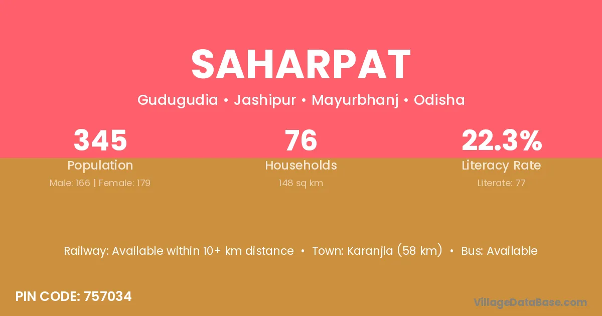 Karanjia (58 km) is the nearest town to Saharpat village for major economic activities and is located approximately 58 km away.