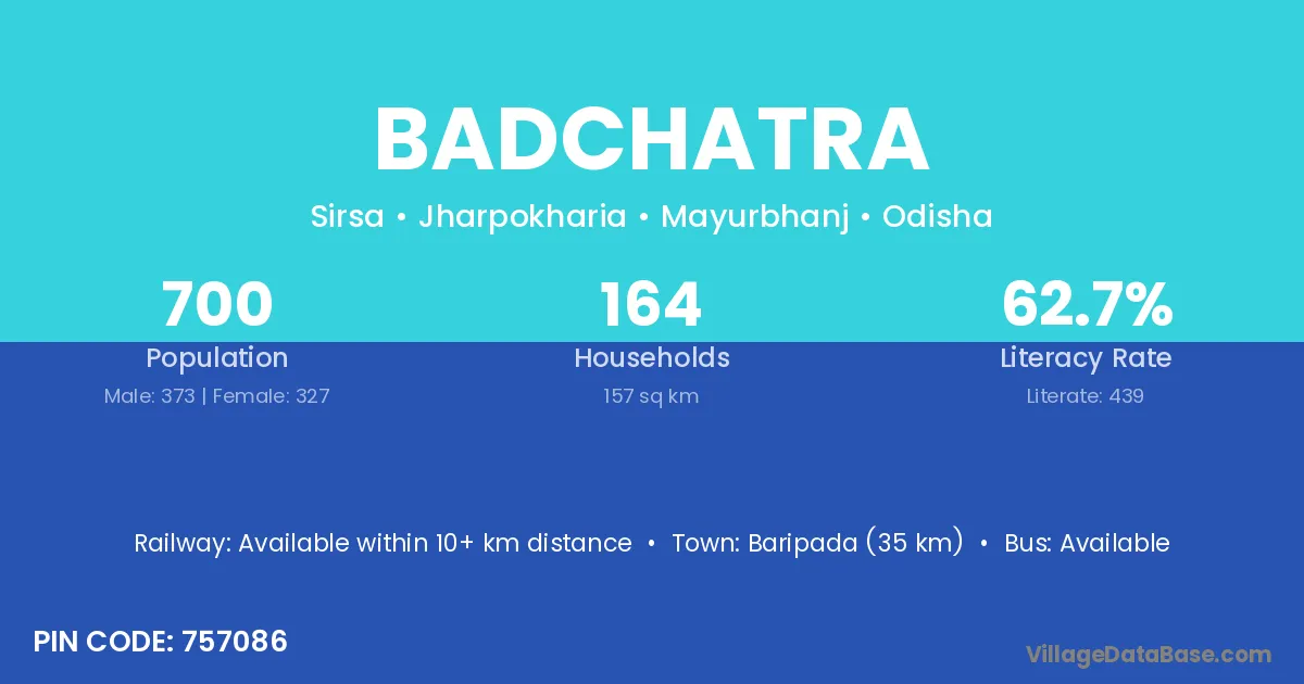 Baripada (35 km) is the nearest town to Badchatra village for major economic activities and is located approximately 35 km away.