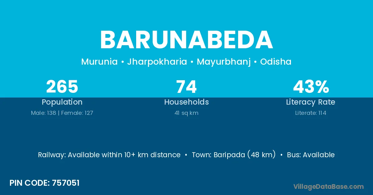 Baripada (48 km) is the nearest town to Barunabeda village for major economic activities and is located approximately 48 km away.