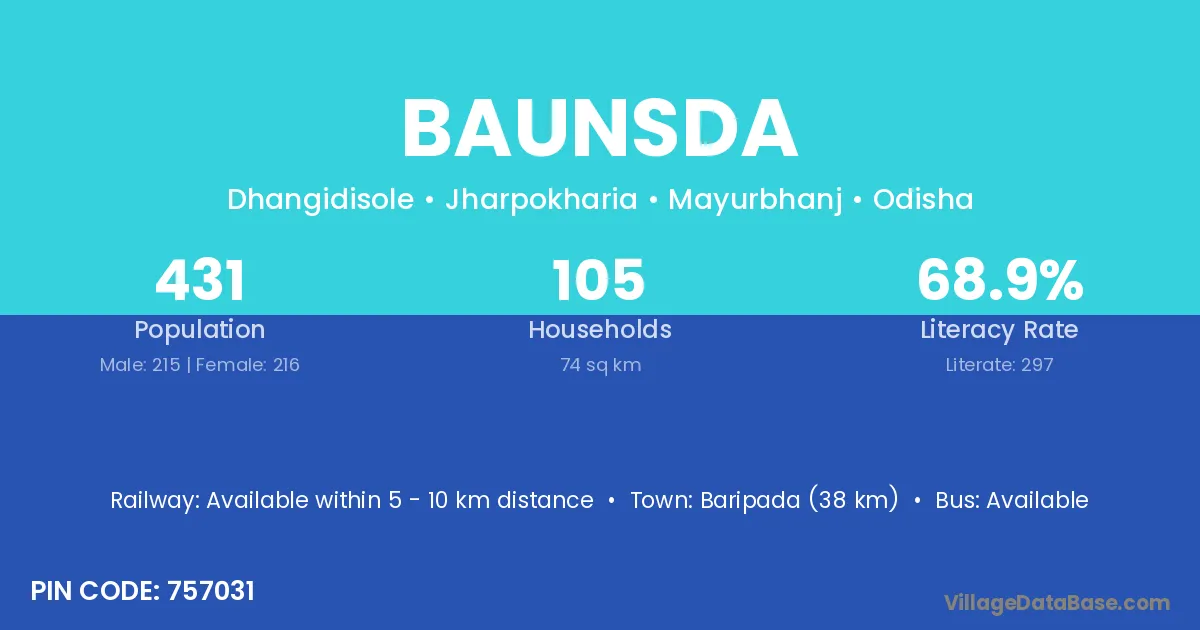 Baripada (38 km) is the nearest town to Baunsda village for major economic activities and is located approximately 38 km away.
