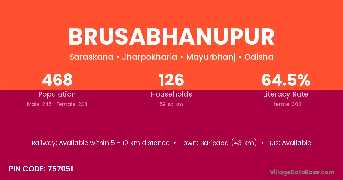 Brusabhanupur village has a total population of 468 people, of which 245 are males and 223 are females.
