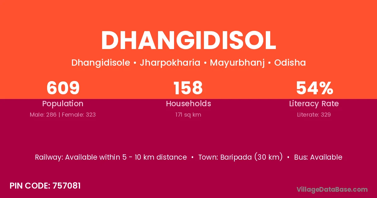 Baripada (30 km) is the nearest town to Dhangidisol village for major economic activities and is located approximately 30 km away.