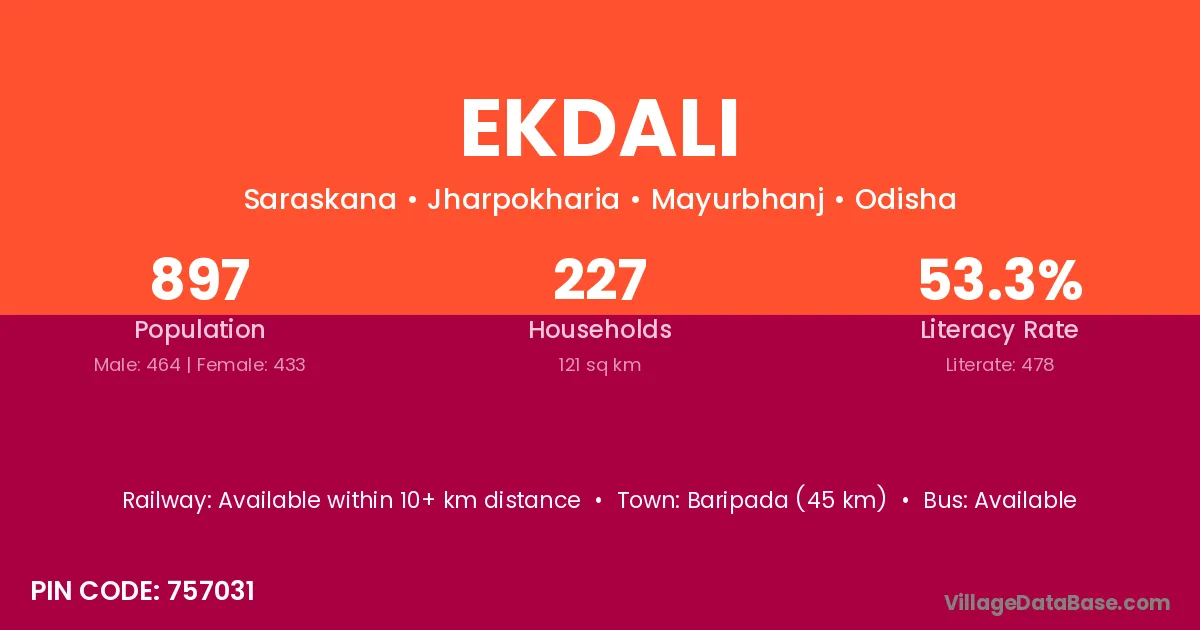 Baripada (45 km) is the nearest town to Ekdali village for major economic activities and is located approximately 45 km away.