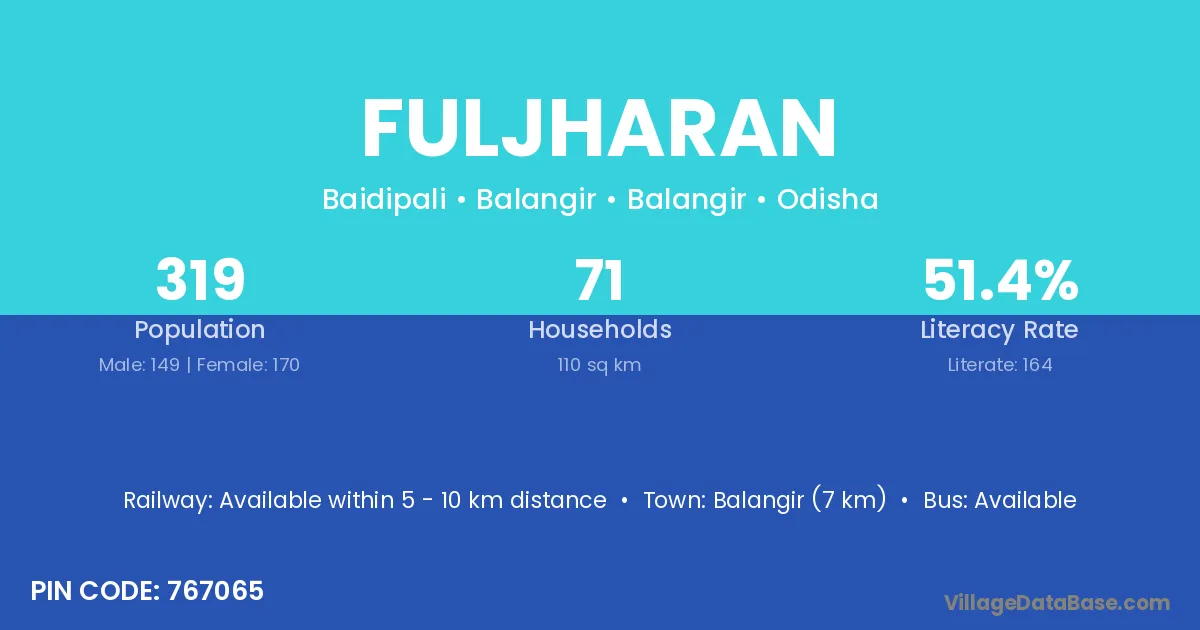 Baripada (73 km) is the nearest town to Fuljharan village for major economic activities and is located approximately 73 km away.