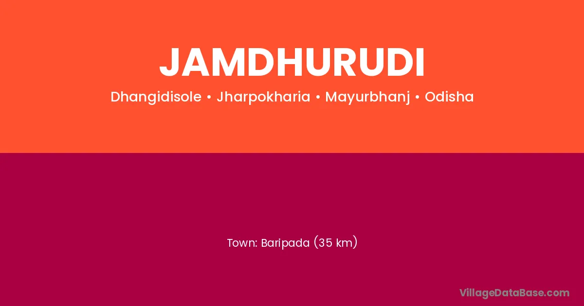 Baripada (35 km) is the nearest town to Jamdhurudi village for major economic activities and is located approximately 35 km away.