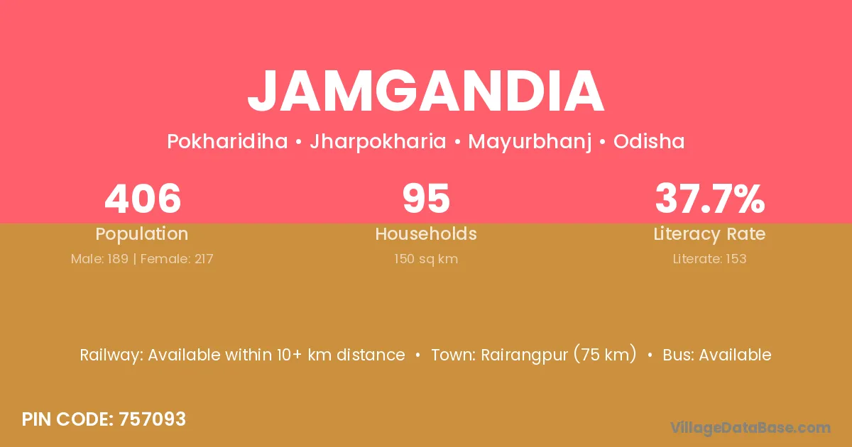 Rairangpur (75 km) is the nearest town to Jamgandia village for major economic activities and is located approximately 75 km away.