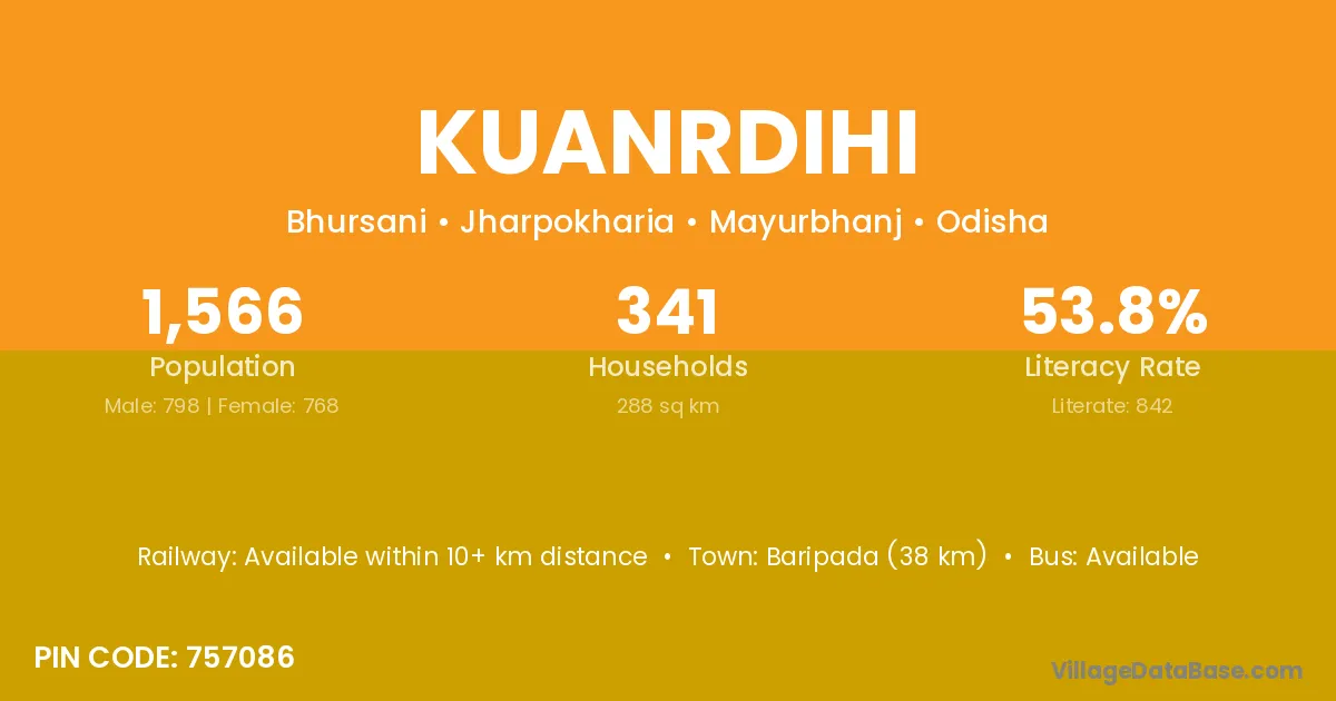 Baripada (38 km) is the nearest town to Kuanrdihi village for major economic activities and is located approximately 38 km away.