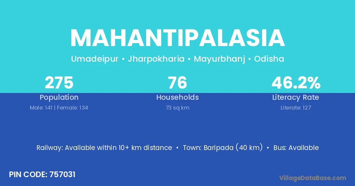 Baripada (40 km) is the nearest town to Mahantipalasia village for major economic activities and is located approximately 40 km away.