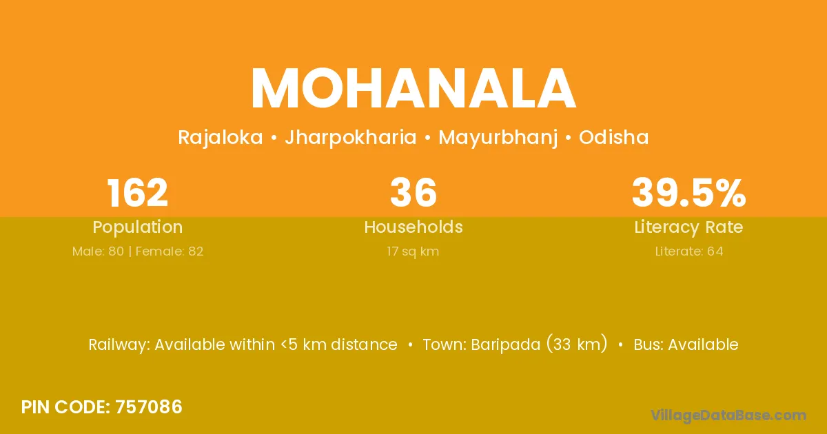 Baripada (33 km) is the nearest town to Mohanala village for major economic activities and is located approximately 33 km away.