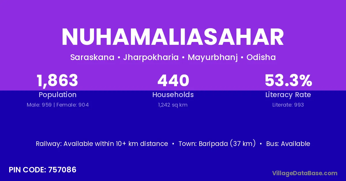Baripada (37 km) is the nearest town to Nuhamaliasahar village for major economic activities and is located approximately 37 km away.
