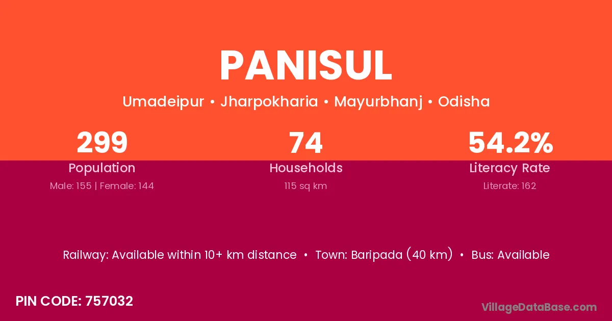 Baripada (40 km) is the nearest town to Panisul village for major economic activities and is located approximately 40 km away.