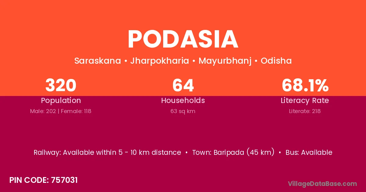 Baripada (45 km) is the nearest town to Podasia village for major economic activities and is located approximately 45 km away.