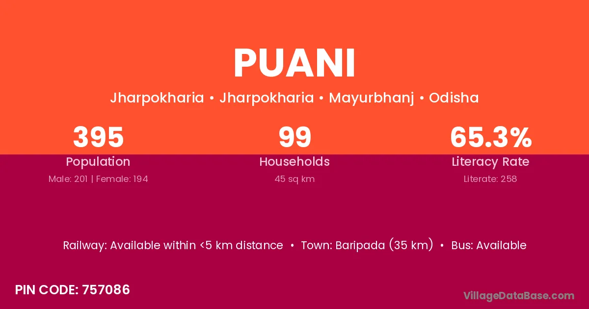 Baripada (35 km) is the nearest town to Puani village for major economic activities and is located approximately 35 km away.