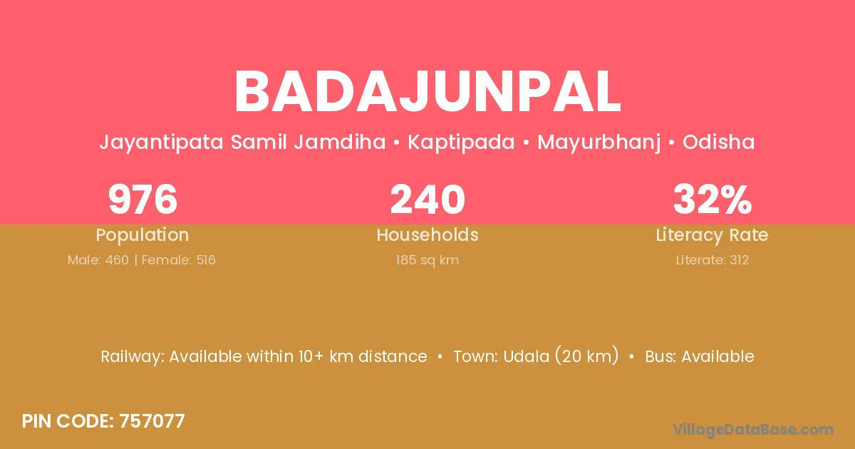 Udala (20 km) is the nearest town to Badajunpal village for major economic activities and is located approximately 20 km away.