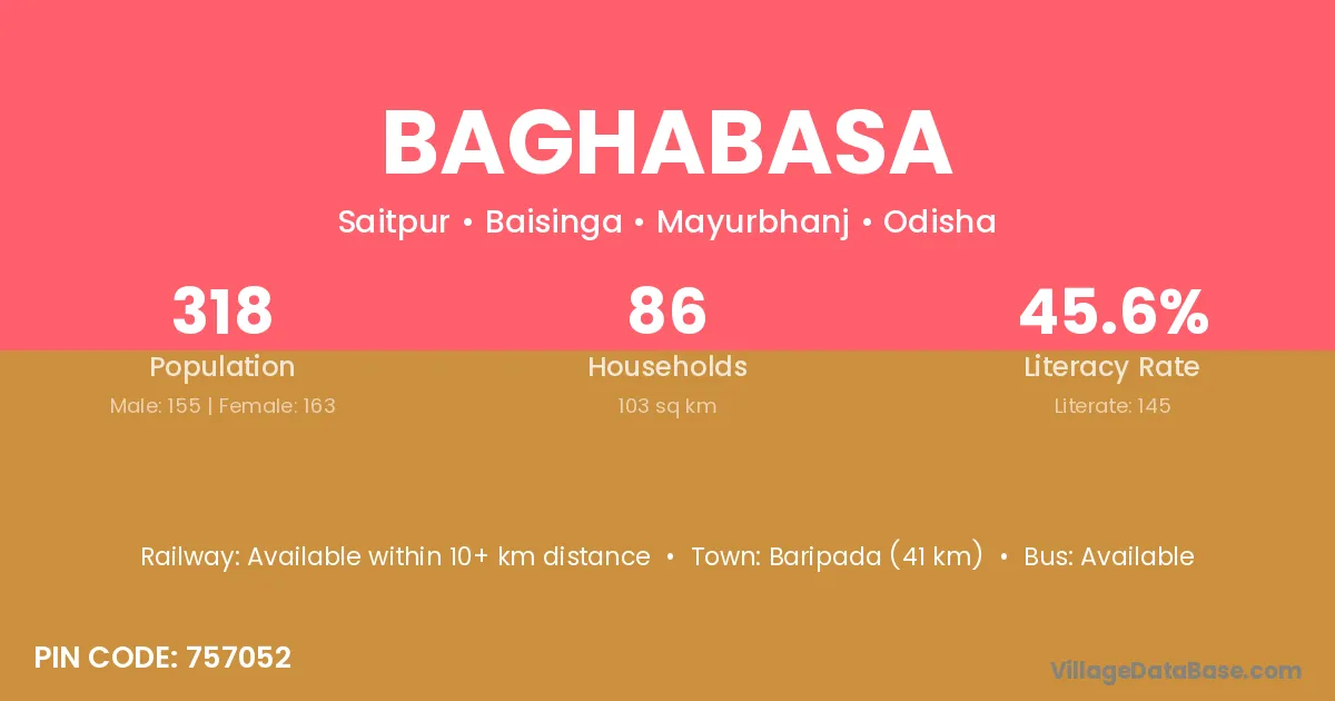 Baghabasa village has a total population of 185 people, of which 99 are males and 86 are females.