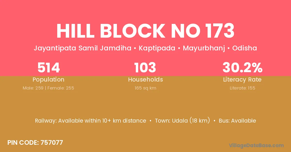 Hill Block No 173 village has a total population of 514 people, of which 259 are males and 255 are females.