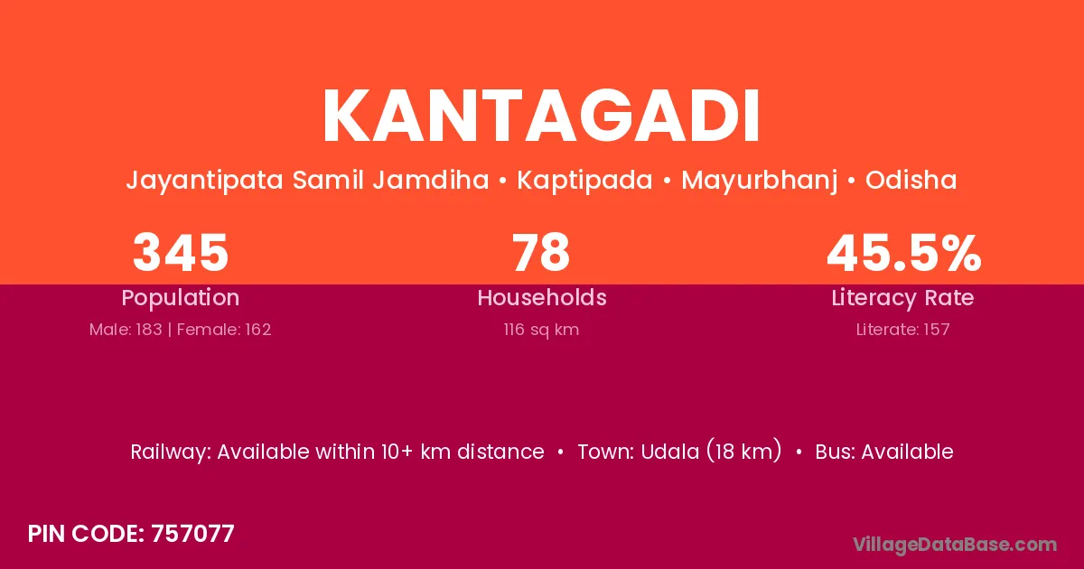 Udala (18 km) is the nearest town to Kantagadi village for major economic activities and is located approximately 18 km away.