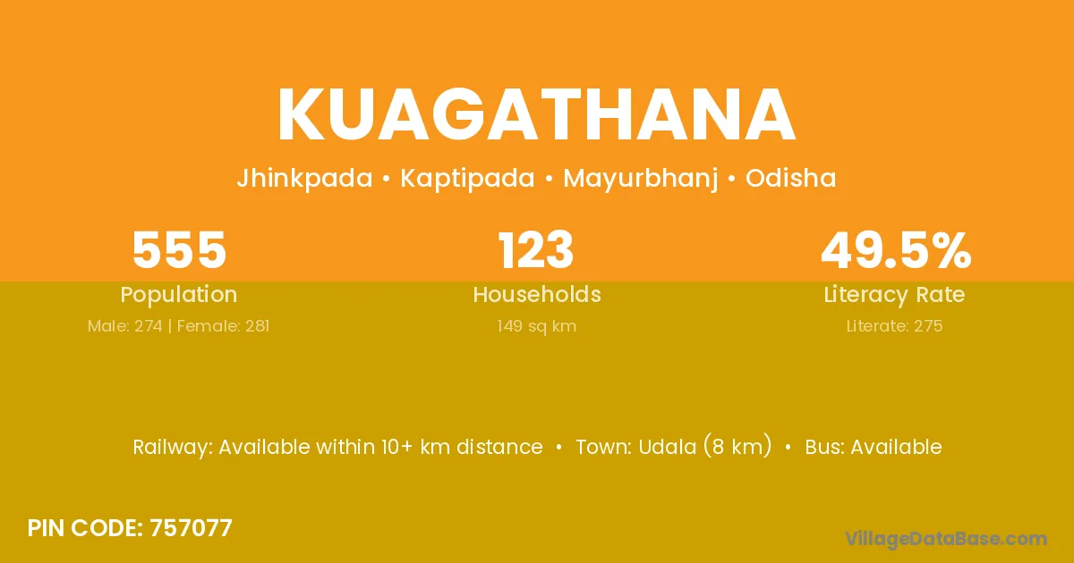 Udala (8 km) is the nearest town to Kuagathana village for major economic activities and is located approximately 8 km away.