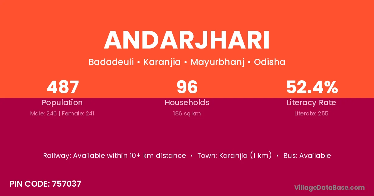 Karanjia (1 km) is the nearest town to Andarjhari village for major economic activities and is located approximately 1 km away.