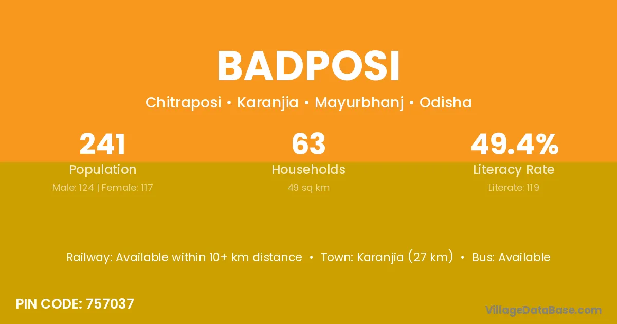 Karanjia (27 km) is the nearest town to Badposi village for major economic activities and is located approximately 27 km away.