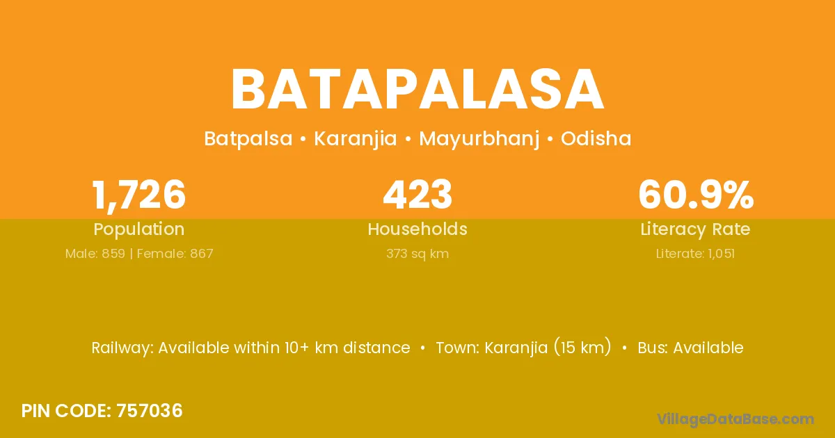 Karanjia (15 km) is the nearest town to Batapalasa village for major economic activities and is located approximately 15 km away.