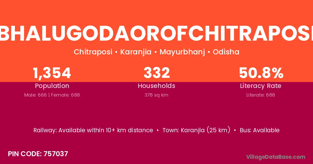 Karanjia (25 km) is the nearest town to Bhalugodaorofchitraposi village for major economic activities and is located approximately 25 km away.
