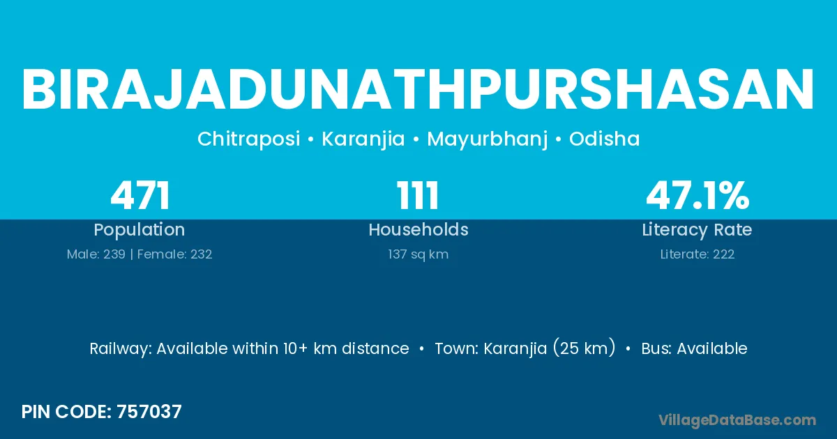 Karanjia (25 km) is the nearest town to Birajadunathpurshasan village for major economic activities and is located approximately 25 km away.