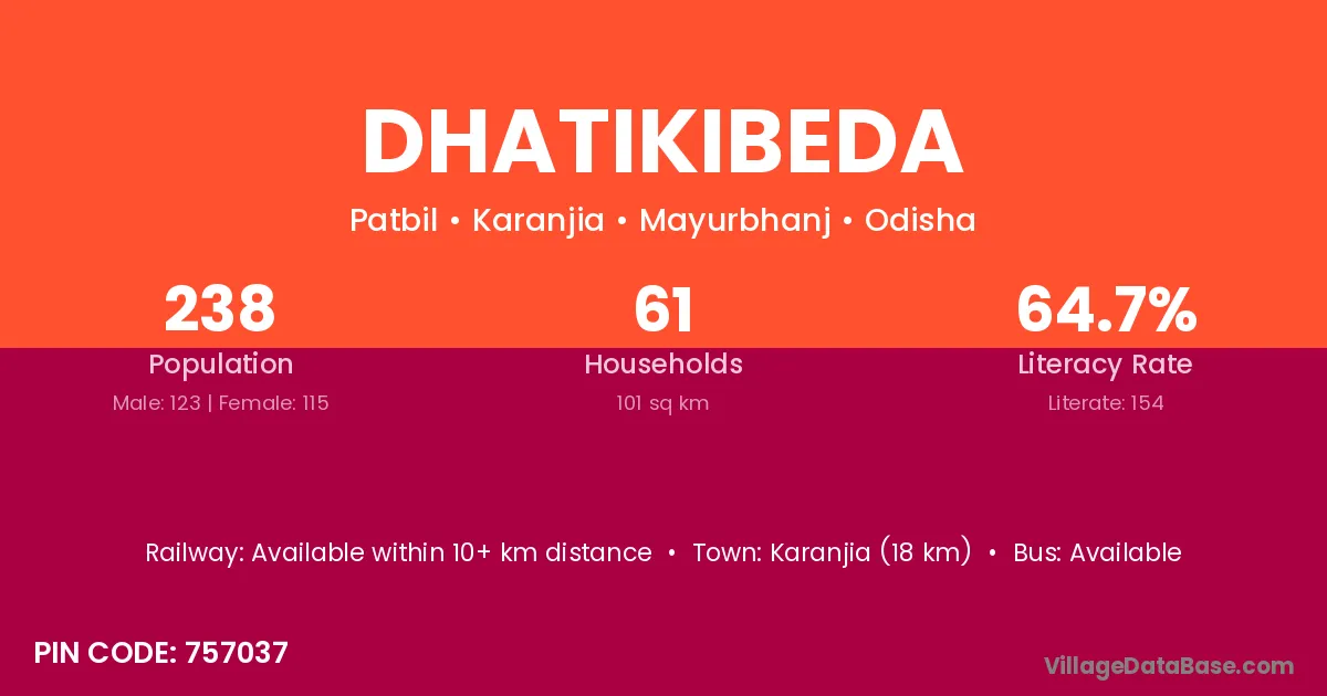 Karanjia (18 km) is the nearest town to Dhatikibeda village for major economic activities and is located approximately 18 km away.