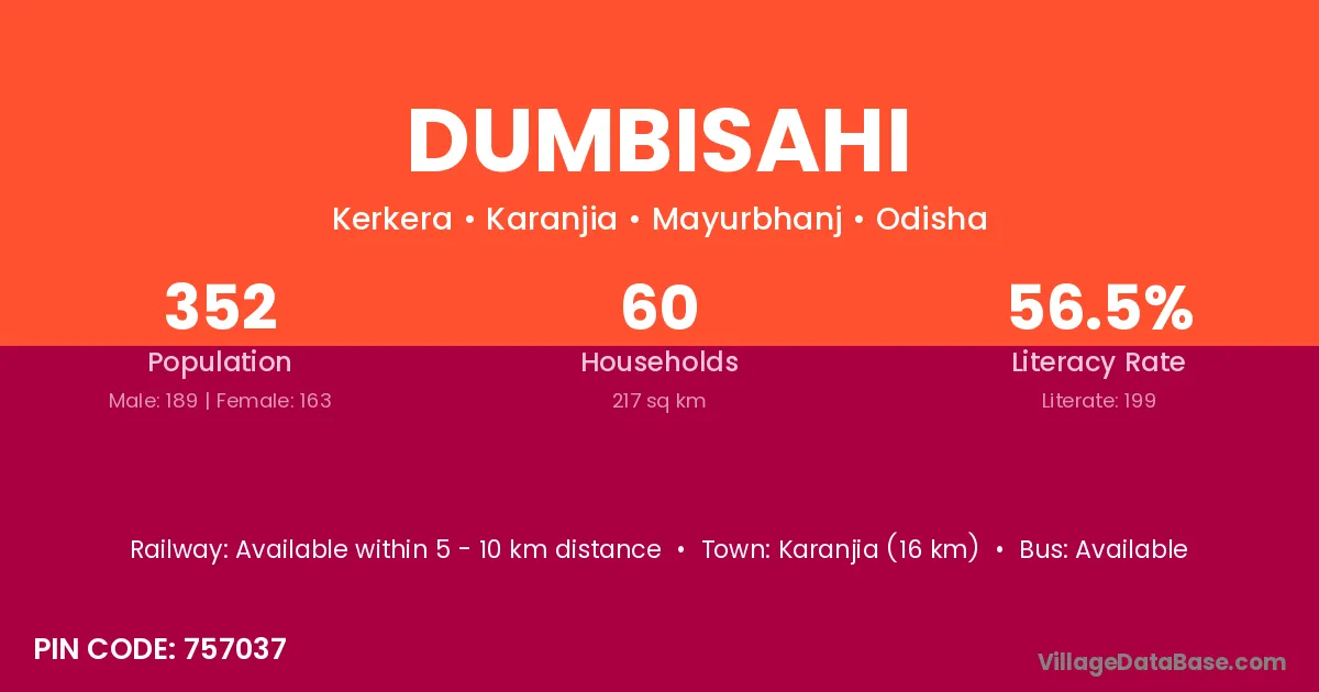 Karanjia (16 km) is the nearest town to Dumbisahi village for major economic activities and is located approximately 16 km away.
