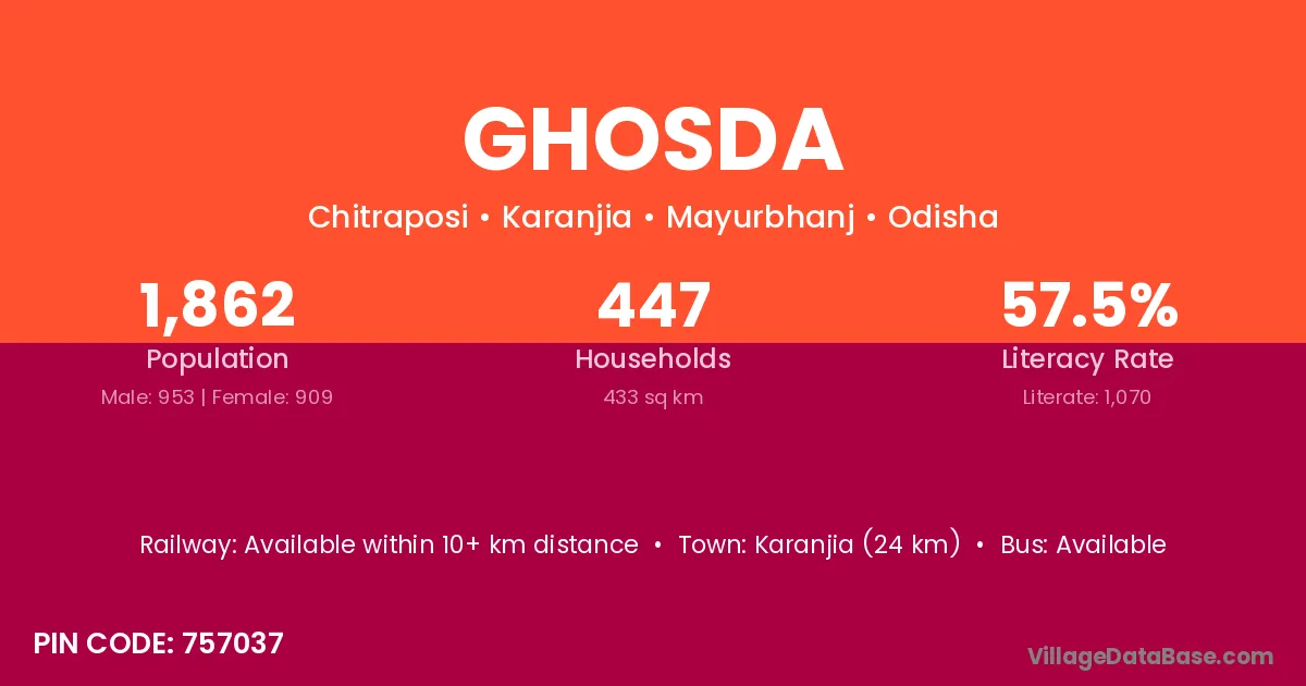 Karanjia (24 km) is the nearest town to Ghosda village for major economic activities and is located approximately 24 km away.