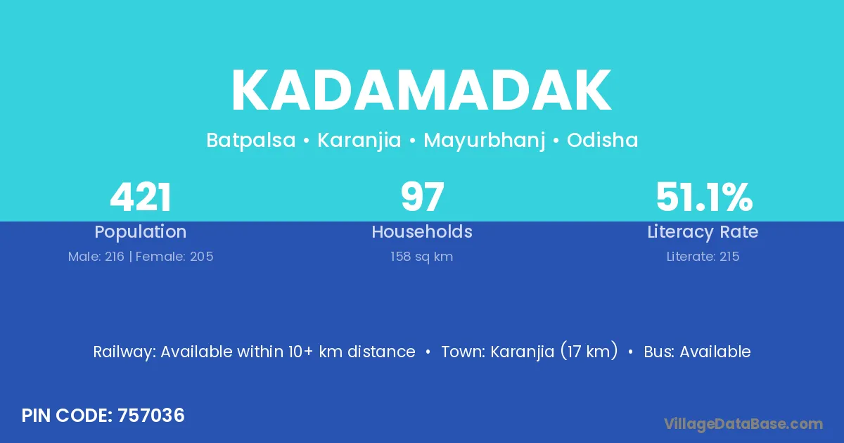 Karanjia (17 km) is the nearest town to Kadamadak village for major economic activities and is located approximately 17 km away.