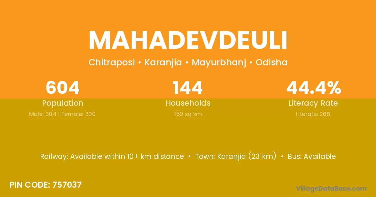Mahadevdeuli village has a total population of 604 people, of which 304 are males and 300 are females.