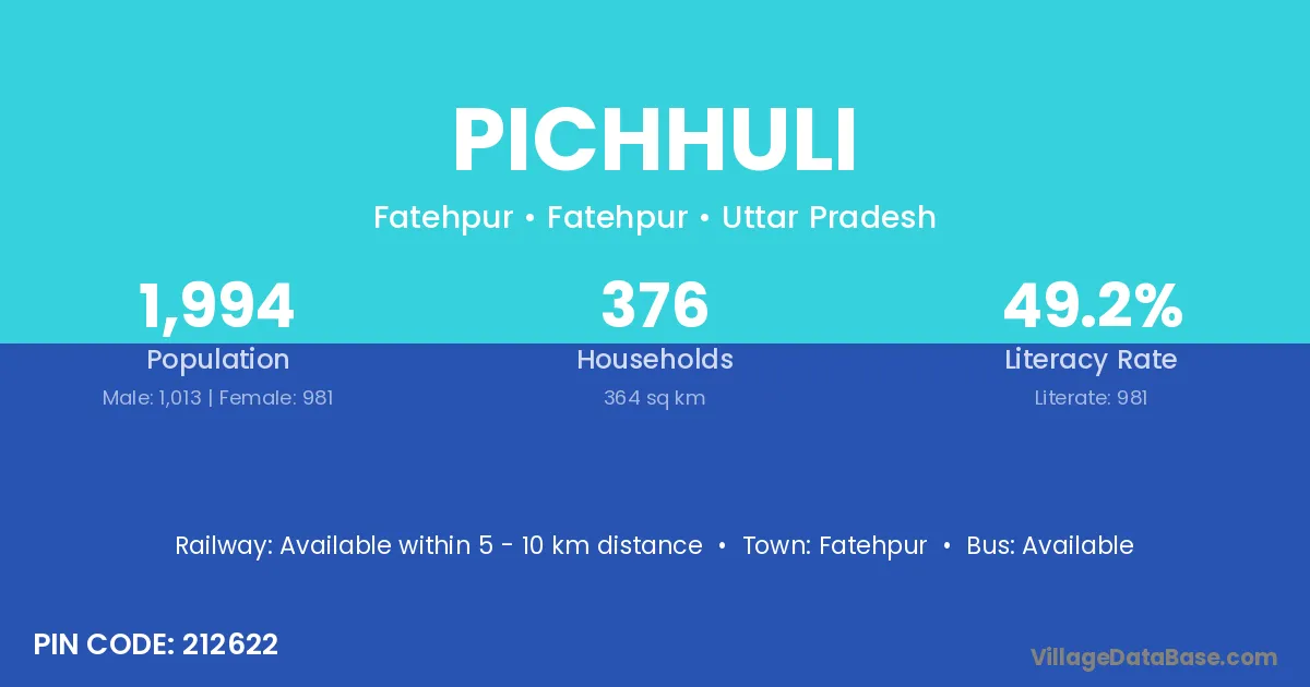 The literacy rate of Pichhuli village is 64.77%. Male literacy stands at 69.92% and female literacy at 58.82%.