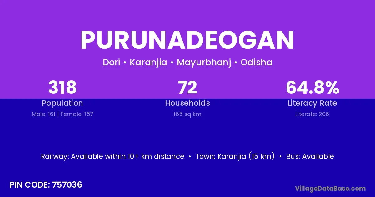 Purunadeogan village has a total population of 318 people, of which 161 are males and 157 are females.