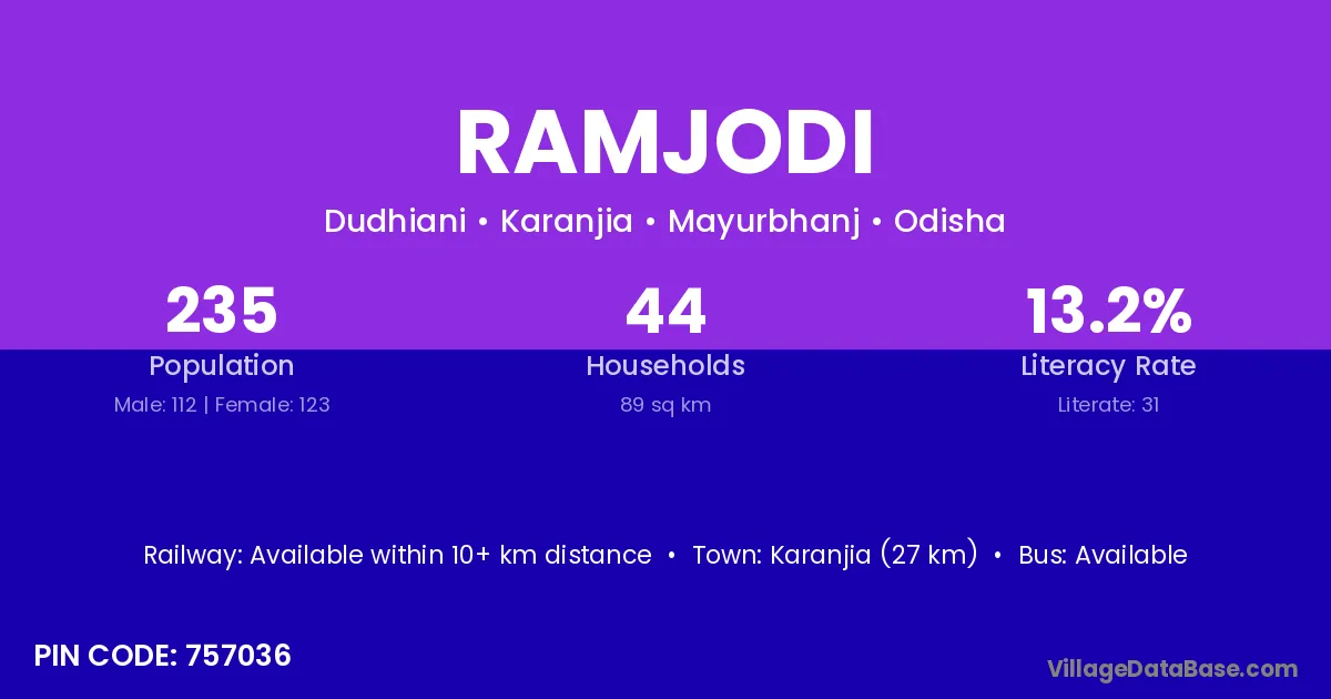 Karanjia (27 km) is the nearest town to Ramjodi village for major economic activities and is located approximately 27 km away.