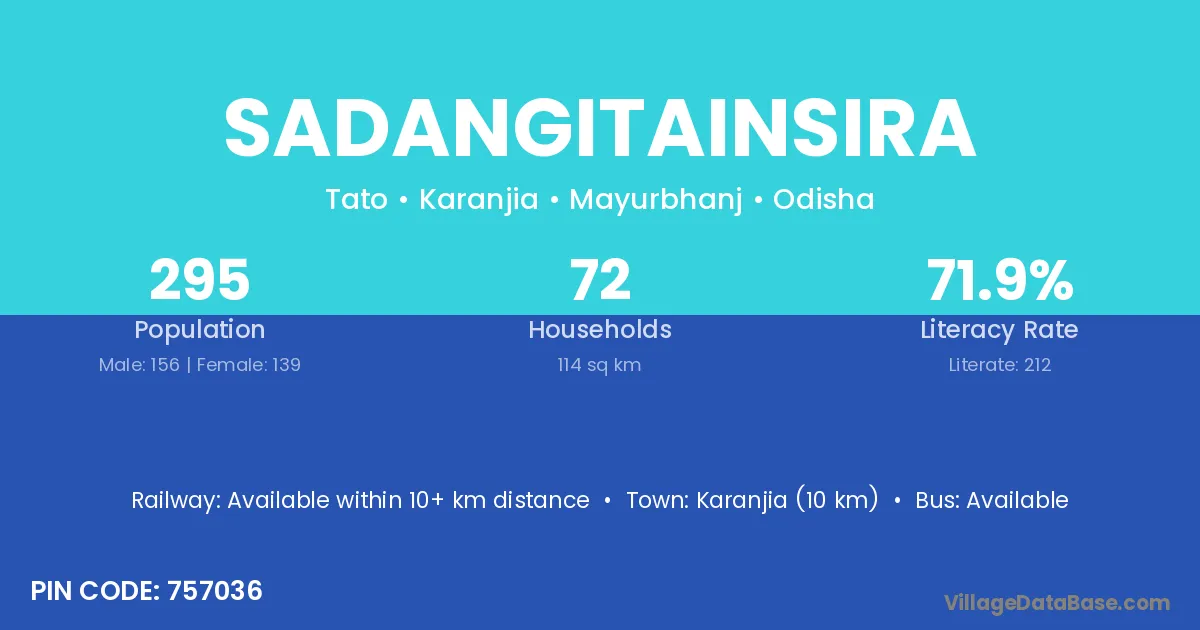 Karanjia (10 km) is the nearest town to Sadangitainsira village for major economic activities and is located approximately 10 km away.
