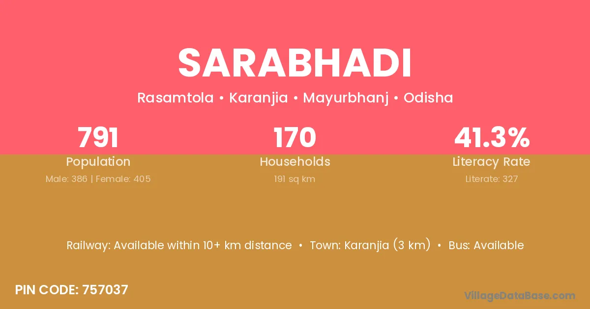 Karanjia (3 km) is the nearest town to Sarabhadi village for major economic activities and is located approximately 3 km away.