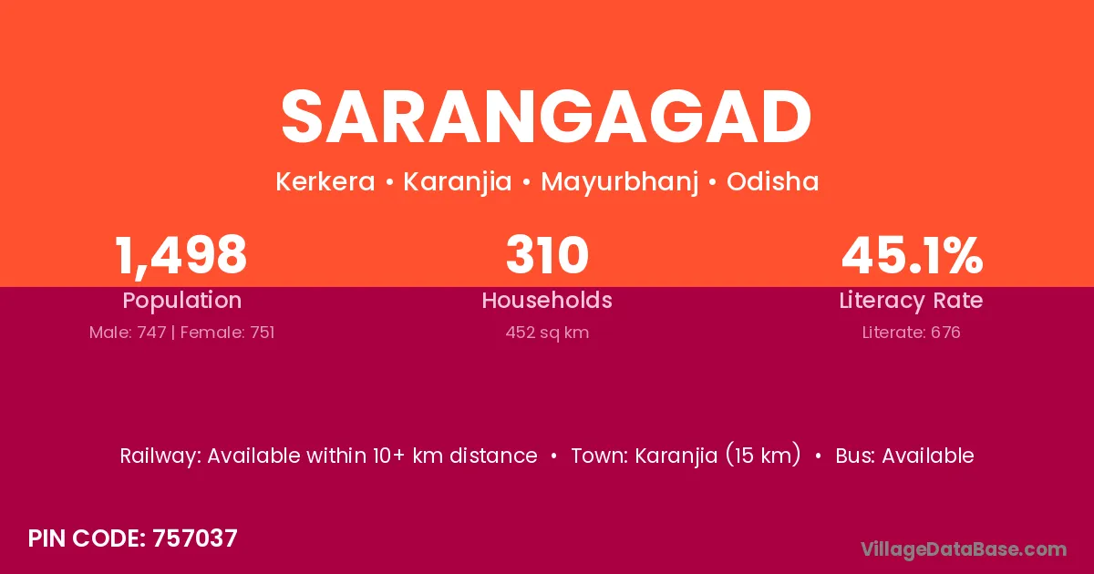 Karanjia (15 km) is the nearest town to Sarangagad village for major economic activities and is located approximately 15 km away.