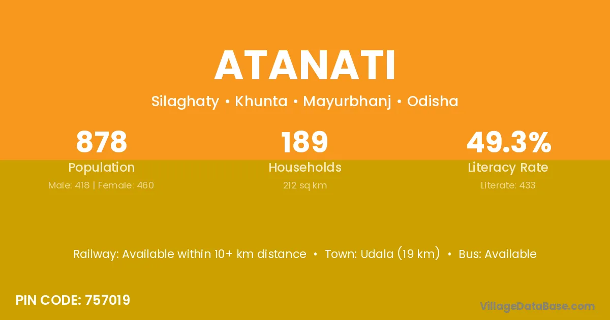 Udala (19 km) is the nearest town to Atanati village for major economic activities and is located approximately 19 km away.