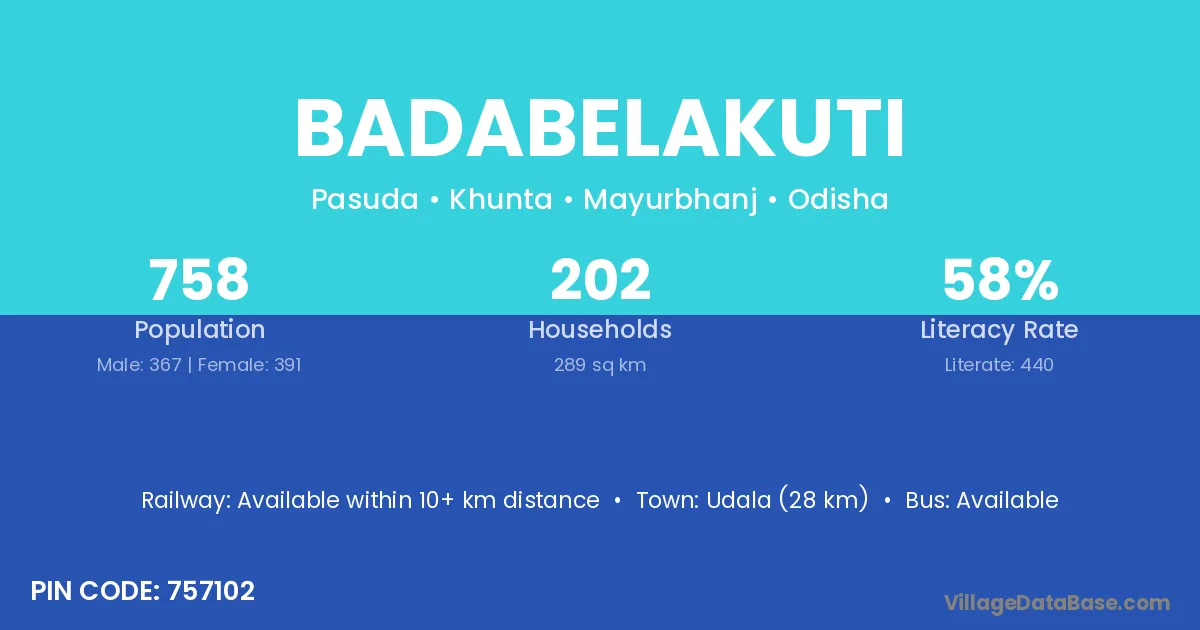 Udala (28 km) is the nearest town to Badabelakuti village for major economic activities and is located approximately 28 km away.