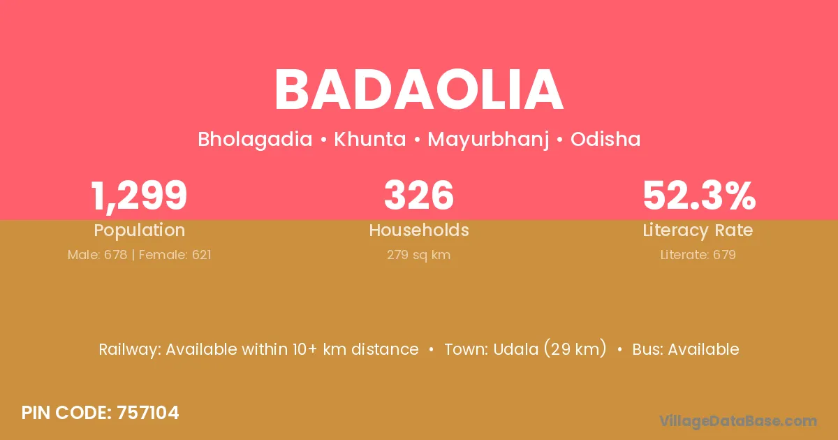Udala (29 km) is the nearest town to Badaolia village for major economic activities and is located approximately 29 km away.