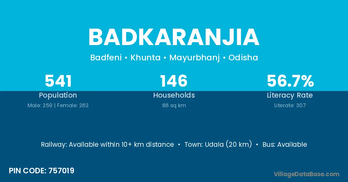 Udala (20 km) is the nearest town to Badkaranjia village for major economic activities and is located approximately 20 km away.